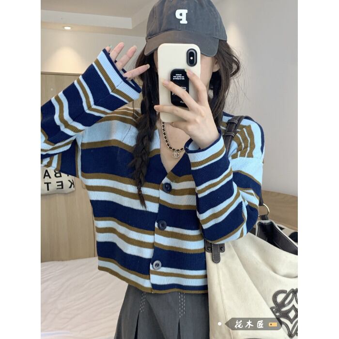 Vネックストライプニットカーディガンオータムショートトップス ロング 秋物 10/5 秋冬 オータム ウインター ナチュラル mi4697980675680