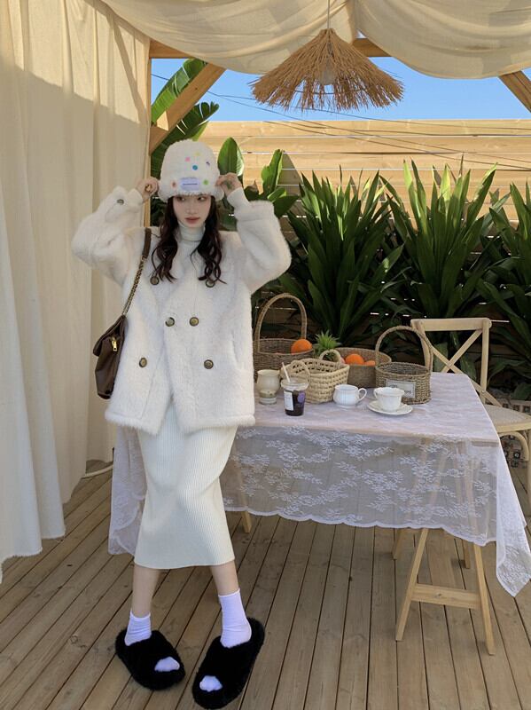 色:ミルクベージュのニットスカート,ブラックニットスカート,白い毛皮のコート,茶色のウールコート