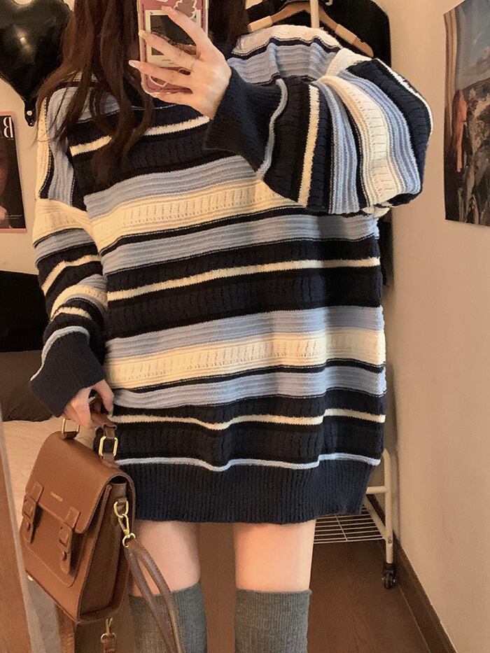 ルーズスタイルラウンドネックセーター オータムカラーストライプニットトップス 秋物 Oネック 10/5 秋冬 オータム ウインター ナチュラル mi464005757715