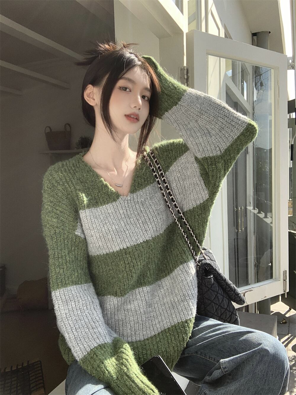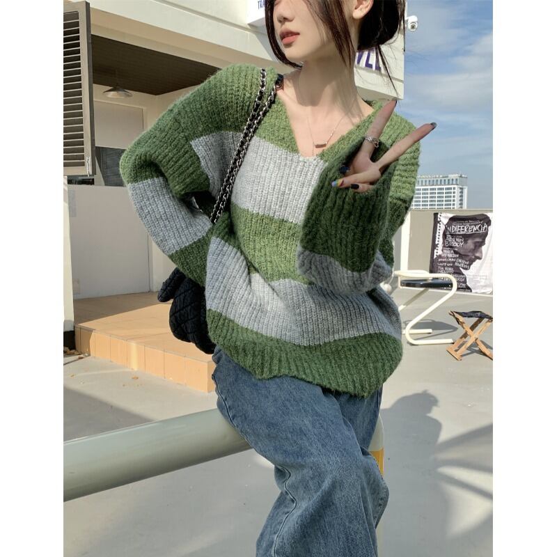 スタイルカラーストライプVネックルーズニットセーター オータムトップス 秋物 10/5 秋冬 オータム ウインター ナチュラル mi4674724387677