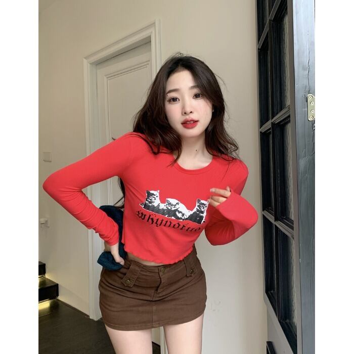 スリムショートニットTシャツ オータムプリント柄長袖スリーブトップス ロング 秋物 10/5 秋冬 オータム ウインター ナチュラル mi4629515364368