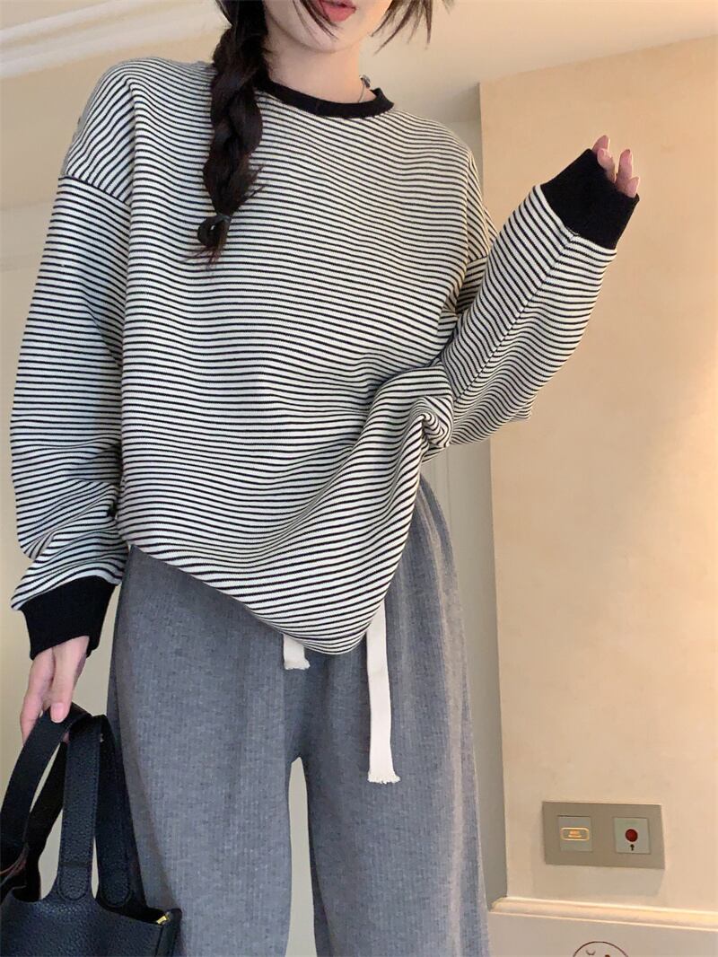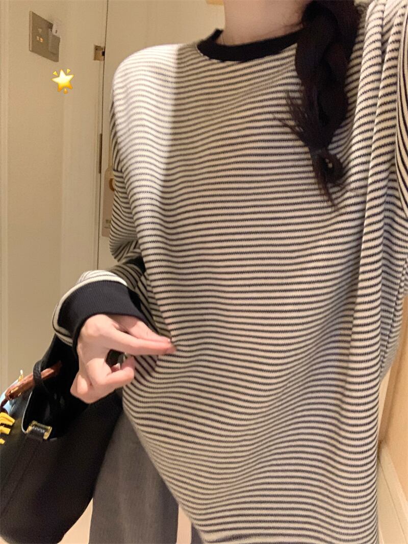 カラーストライプルーズTシャツ シャツ オータムウィンターラウンドネックトップス ロング 秋物 冬物 Oネック 10/5 秋冬 オータム ウインター ナチュラル mi4648192915644