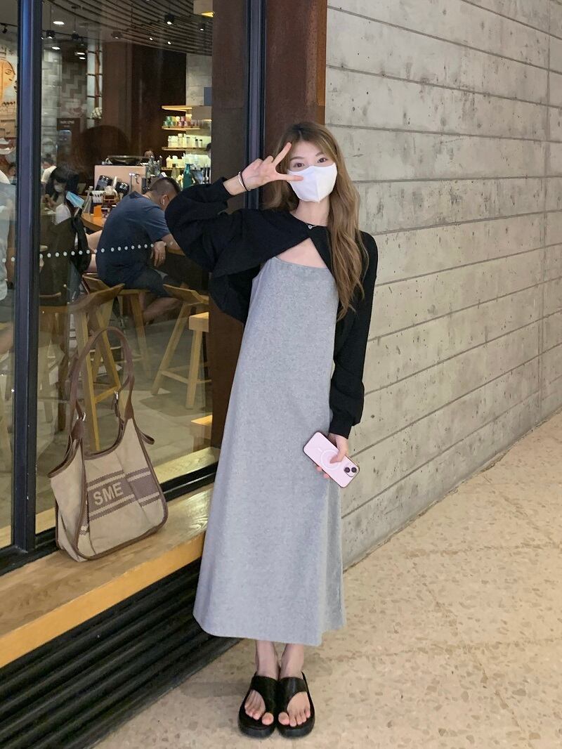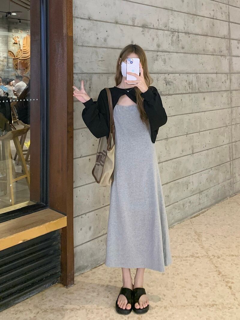 色:黒のブラウスワンピース,グレーのドレス