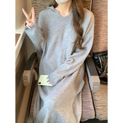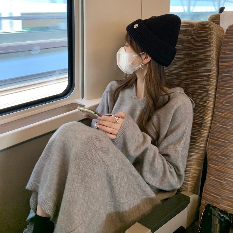 グレーフードニットドレス オータムルーズ薄手Aラインスカート 秋物 10/5 秋冬 オータム ウインター ナチュラル mi4699429312859