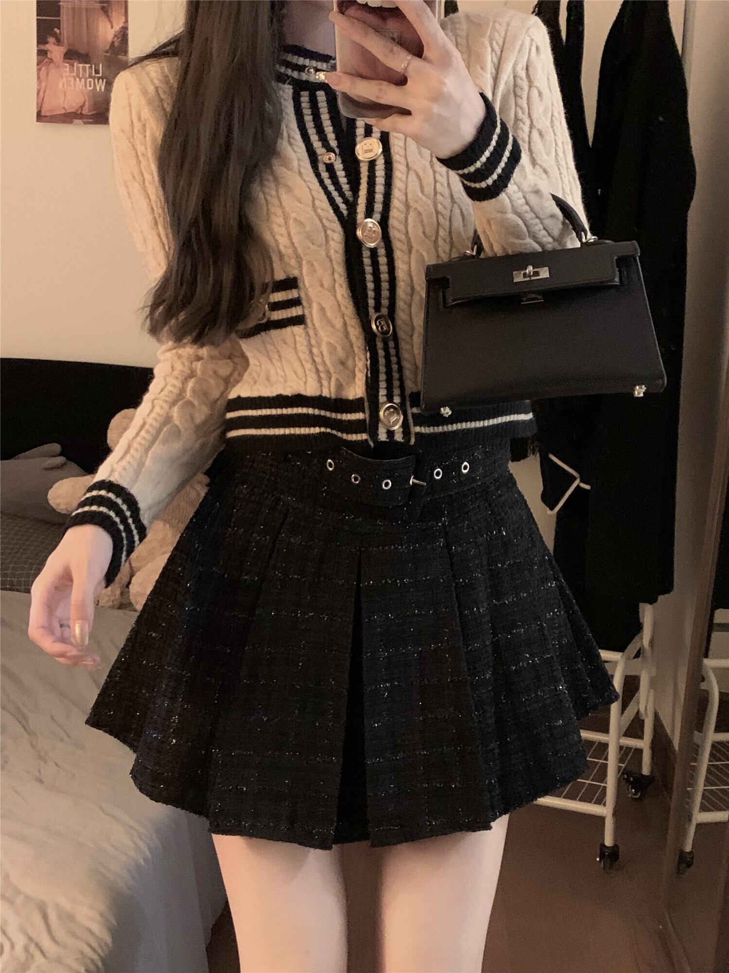 色:糸スカート,黒いセーター,ミルクアプリコットセーター
