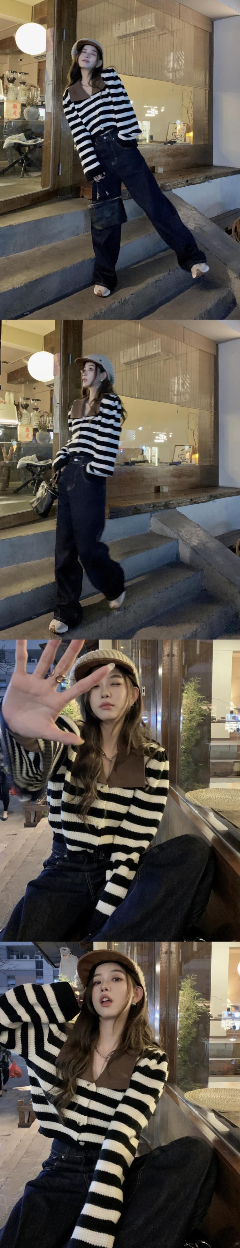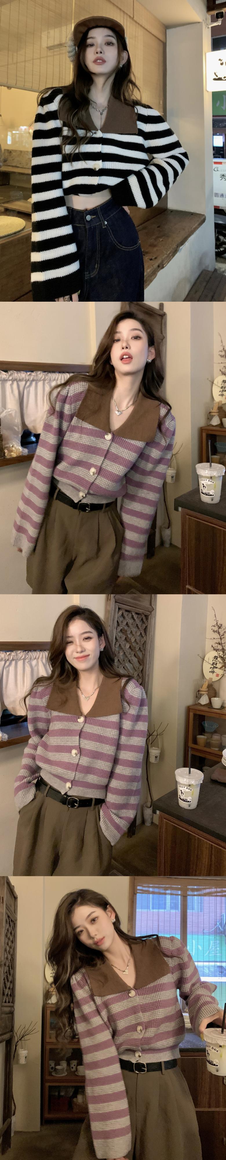 スタンダードストライプカラーセーター カーディガンオータム薄手ショートニットトップス レトロ 秋物 10/5 秋冬 オータム ウインター ナチュラル mi467972816512